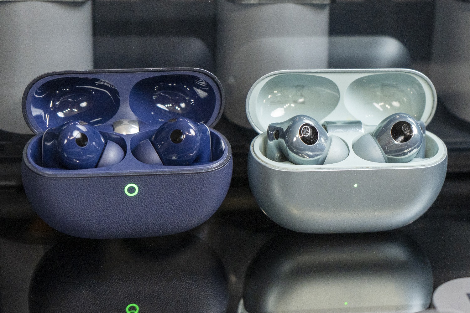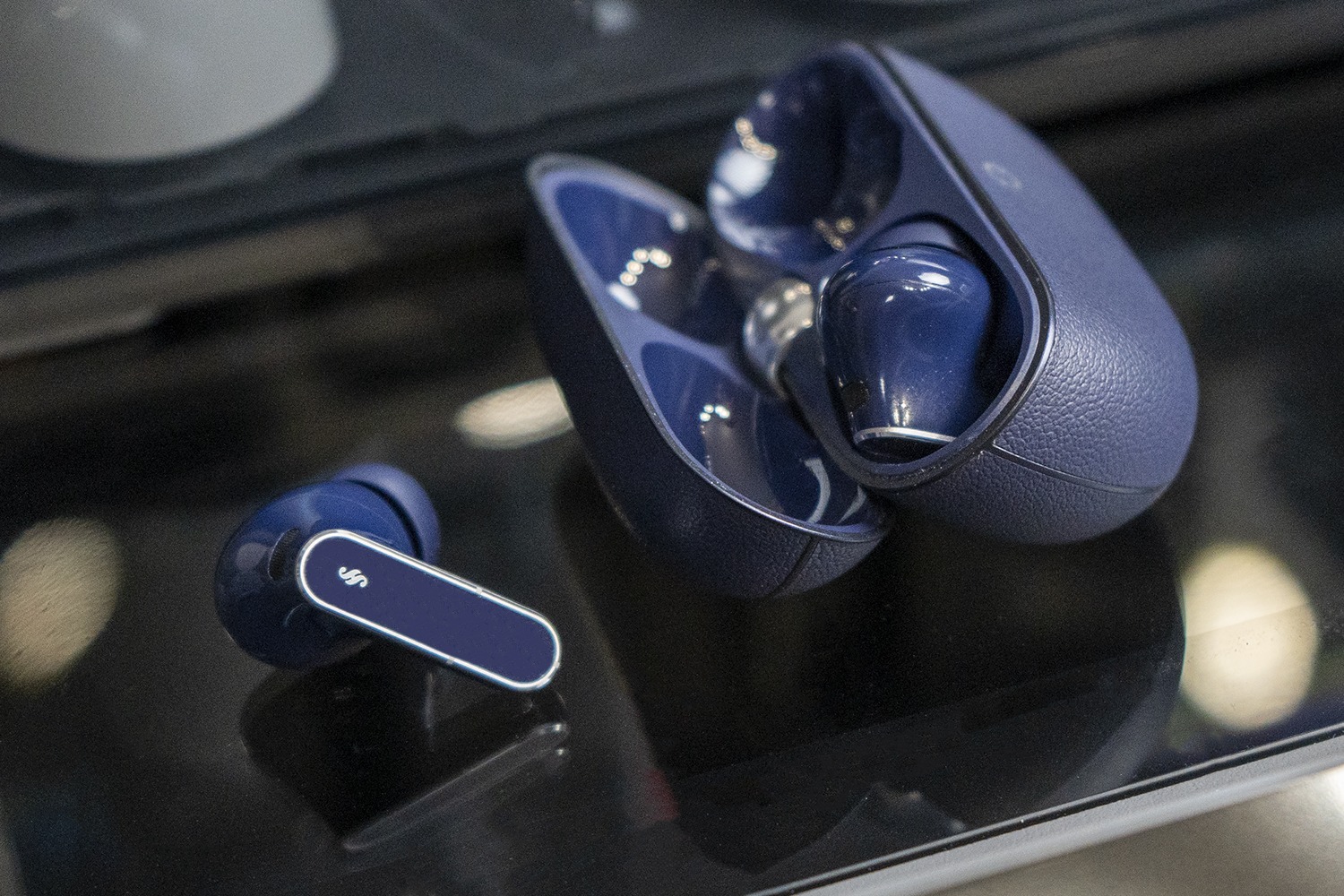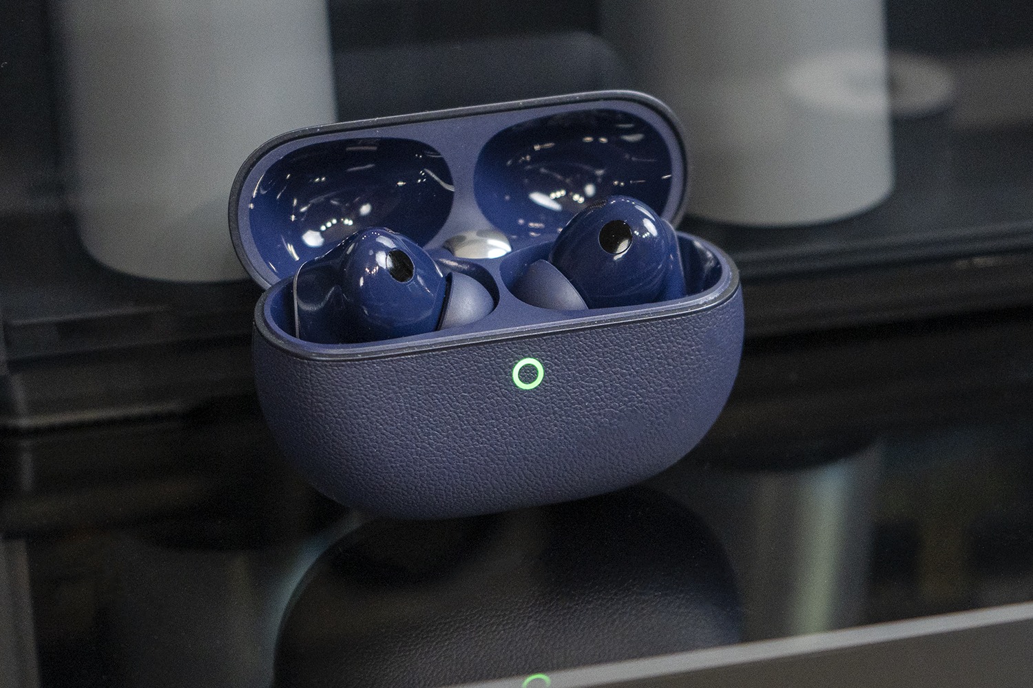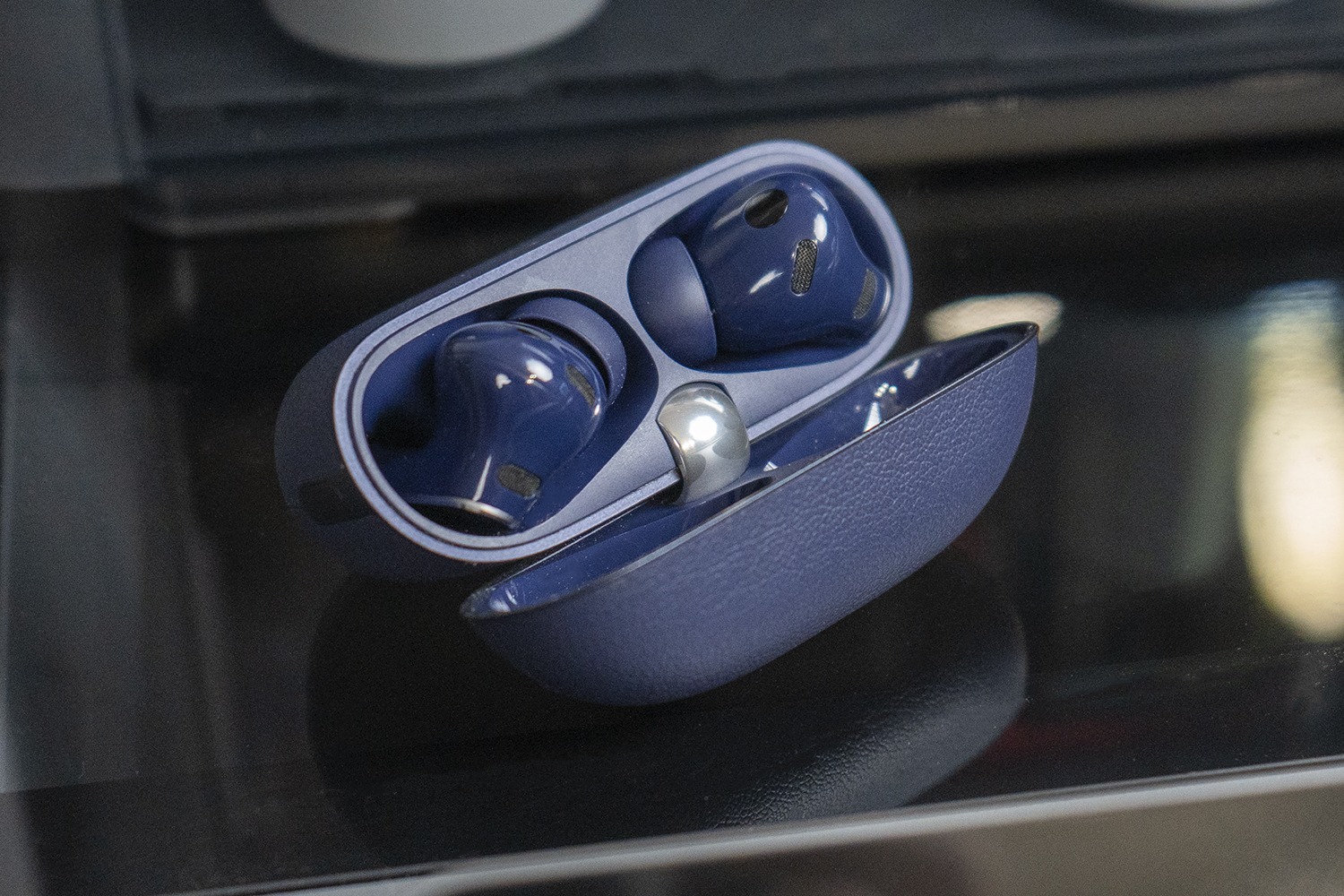 Я выбрал синюю версию, потому что она визуально выделяется за счёт покрытия корпуса кейса под кожу. Это первый случай в истории линейки. Скажу честно: на настоящую кожу это не похоже, пластик чувствуется сразу. Но на ощупь корпус всё равно приятный, и текстура добавляет ему характер. Особенно если до этого вы, как я, уже пользовались предыдущими поколениями этих наушников и хочется что-то поменять. Ведь корпус по форме изменился минимально. Из самых серьезных отличий можно отметить только уменьшение внешней части шарнира.