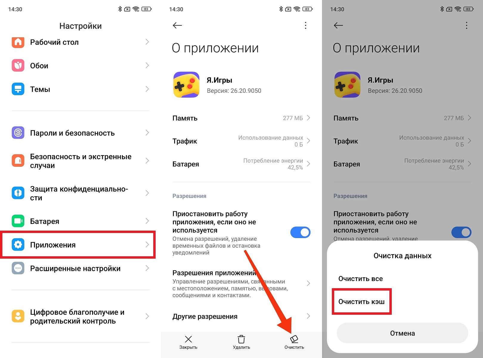 - Зайдите в «Настройки» — «Приложения» — «Яндекс Игры» — «Хранилище» — «Очистить кэш».