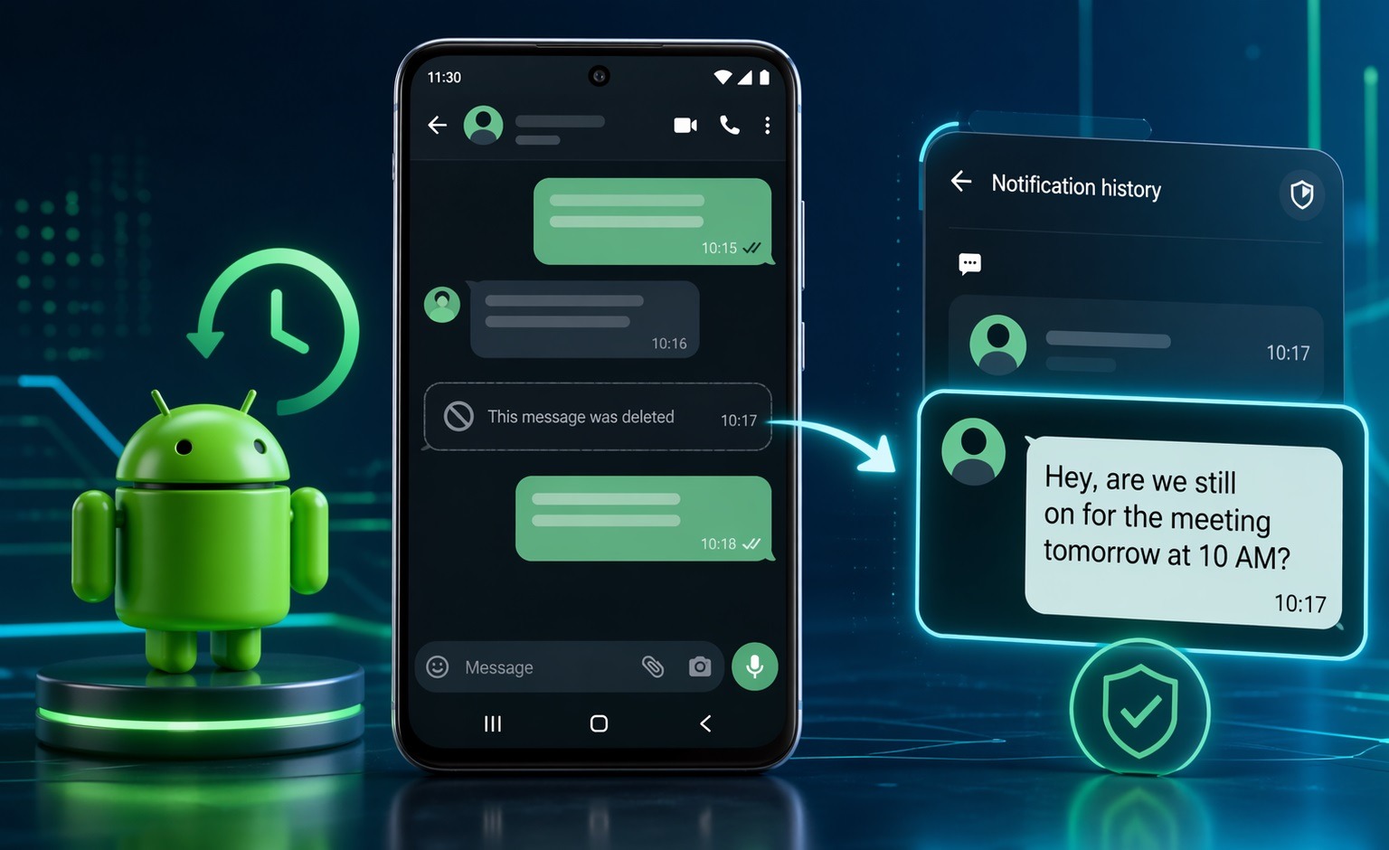 - История уведомлений: работает, если уведомление об этом сообщении успело появиться до его удаления. Текст сохраняется в журнале уведомлений Android независимо от того, что происходит в самом приложении.