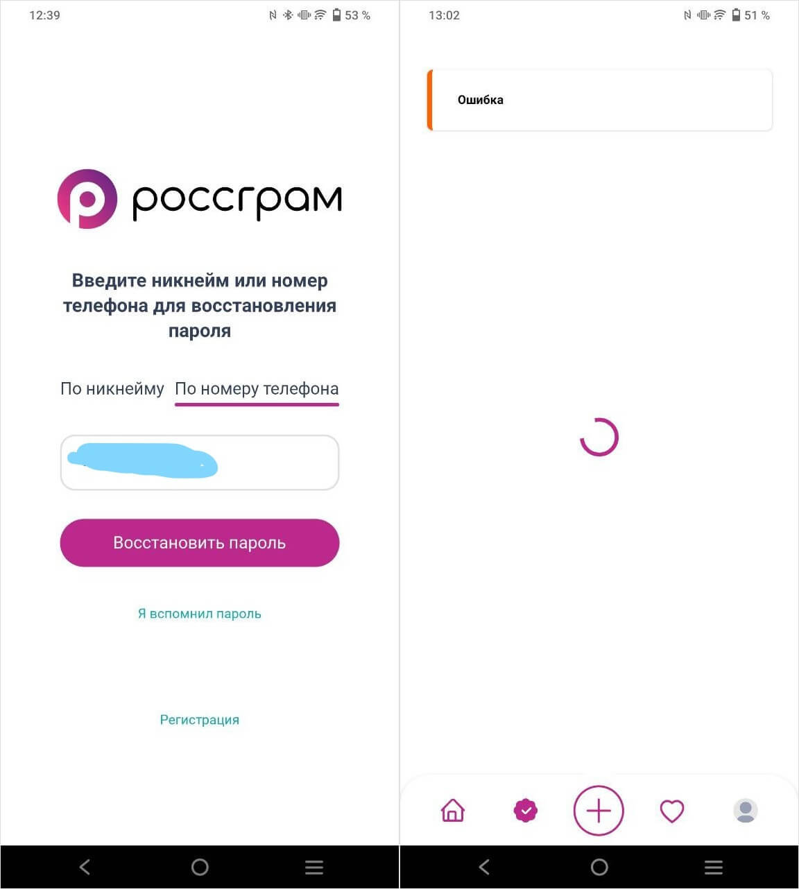 А вот войти в Россграм с первого раза не вышло — приложение вновь выдало ошибку. Перезайти заново тоже не получилось — клиент попросту ушел в бесконечную загрузку и раз за разом отображал ошибку вверху экрана. Шутка ли, но я даже попробовал войти в Россграм с VPN (ну, мало ли?), но это тоже не помогло. В итоге, удалось лишь спустя 20 минут.