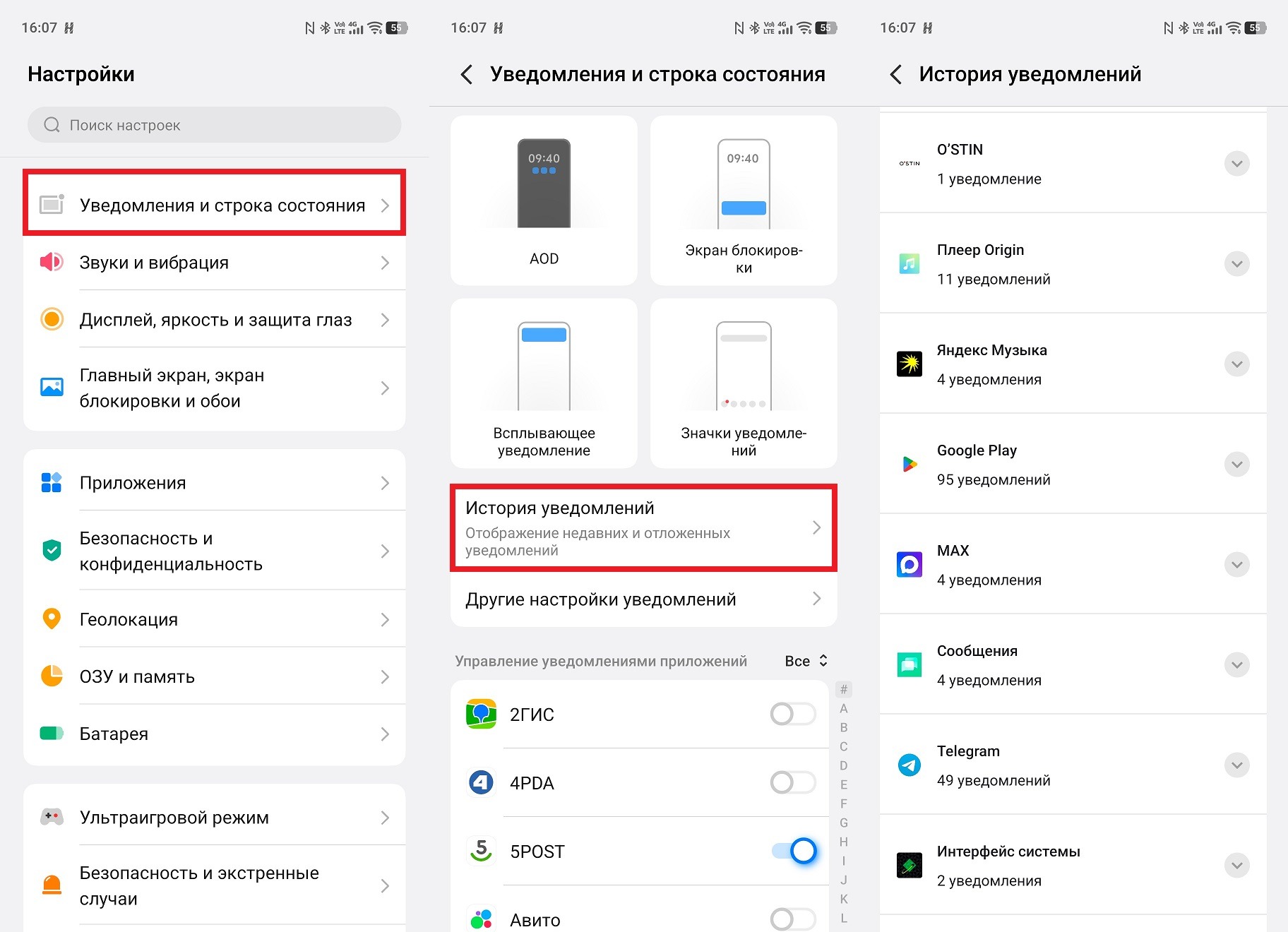 - Найдите пункт «История уведомлений» и включите его (по умолчанию он выключен).
