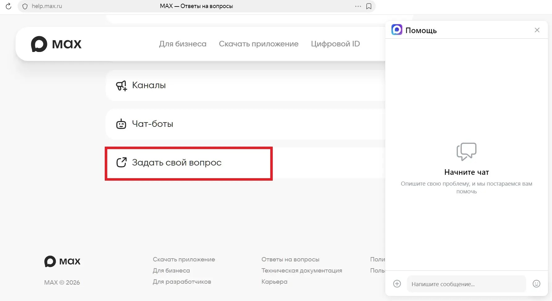 Если готовый ответ не нашелся, на сайте поддержки MAX есть кнопка «Задать свой вопрос». После нажатия откроется чат с поддержкой — тот же бот @support, что и в приложении, только в браузерном интерфейсе. Удобно, если у вас не работает MAX на телефоне и зайти через приложение невозможно. Или если просто привычнее работать с браузера (набрать развернутое обращение на клавиатуре компьютера быстрее, чем тыкать пальцем в экран).