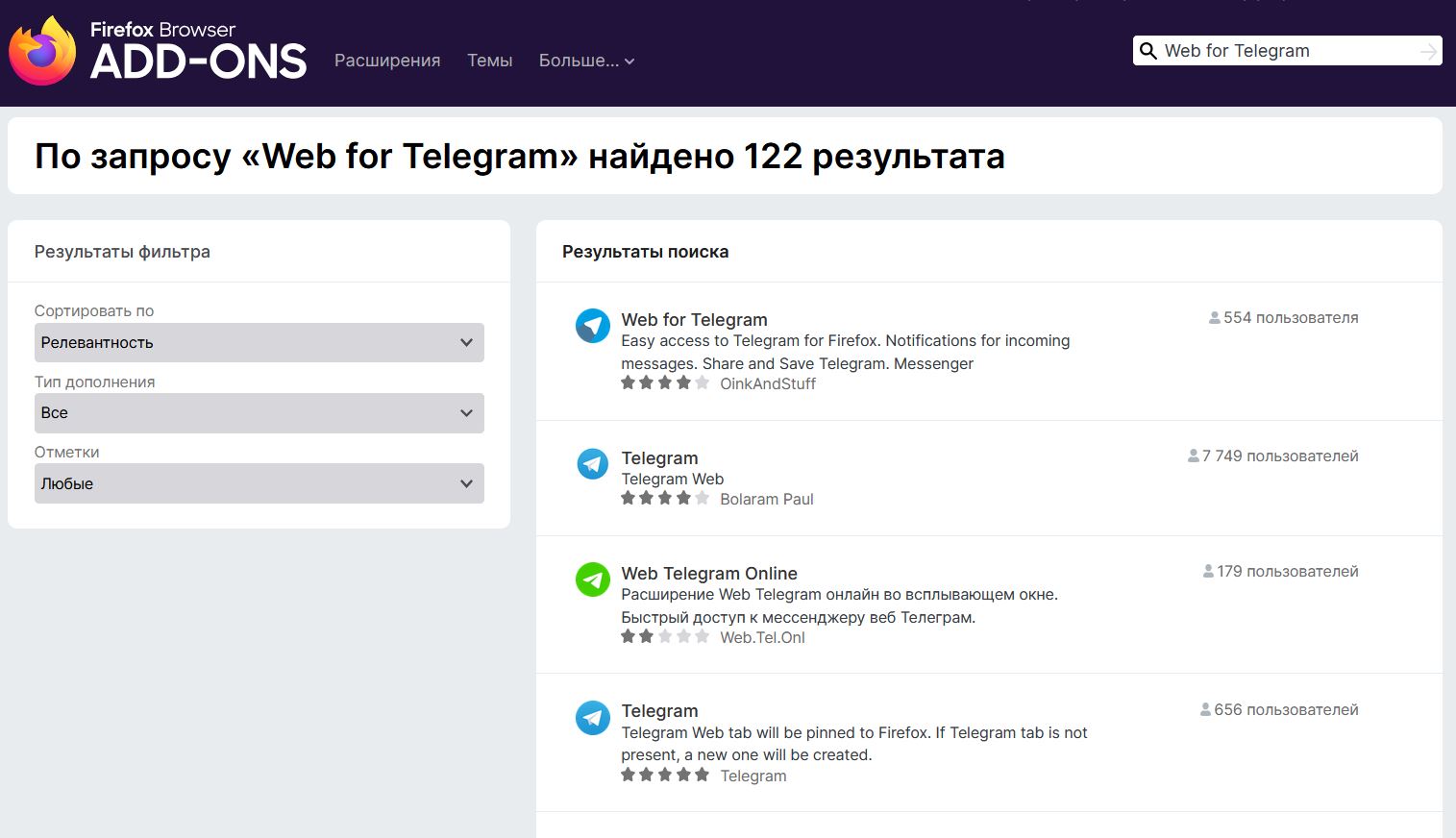- В поиске введите «Web Telegram» и выберите это расширение.