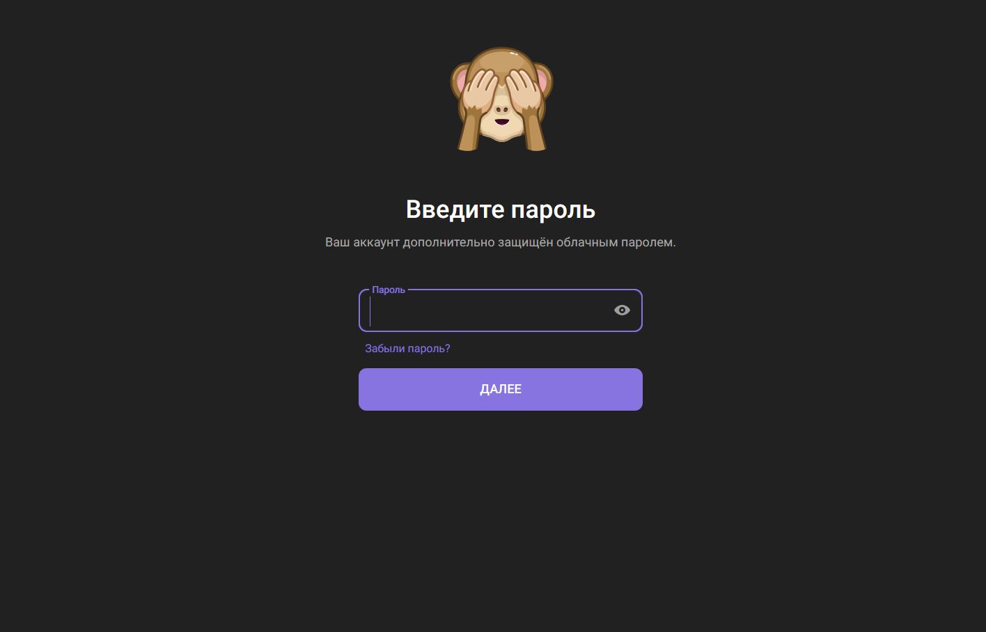 - Если у вас включена двухфакторная аутентификация, потребуется ввести облачный пароль — тот, который вы устанавливали в настройках безопасности Telegram.