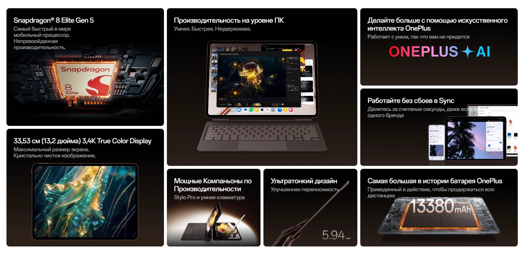 Перед тем как говорить о фишках, посмотрим на железо. Характеристики OnePlus Pad 4 выглядят так: